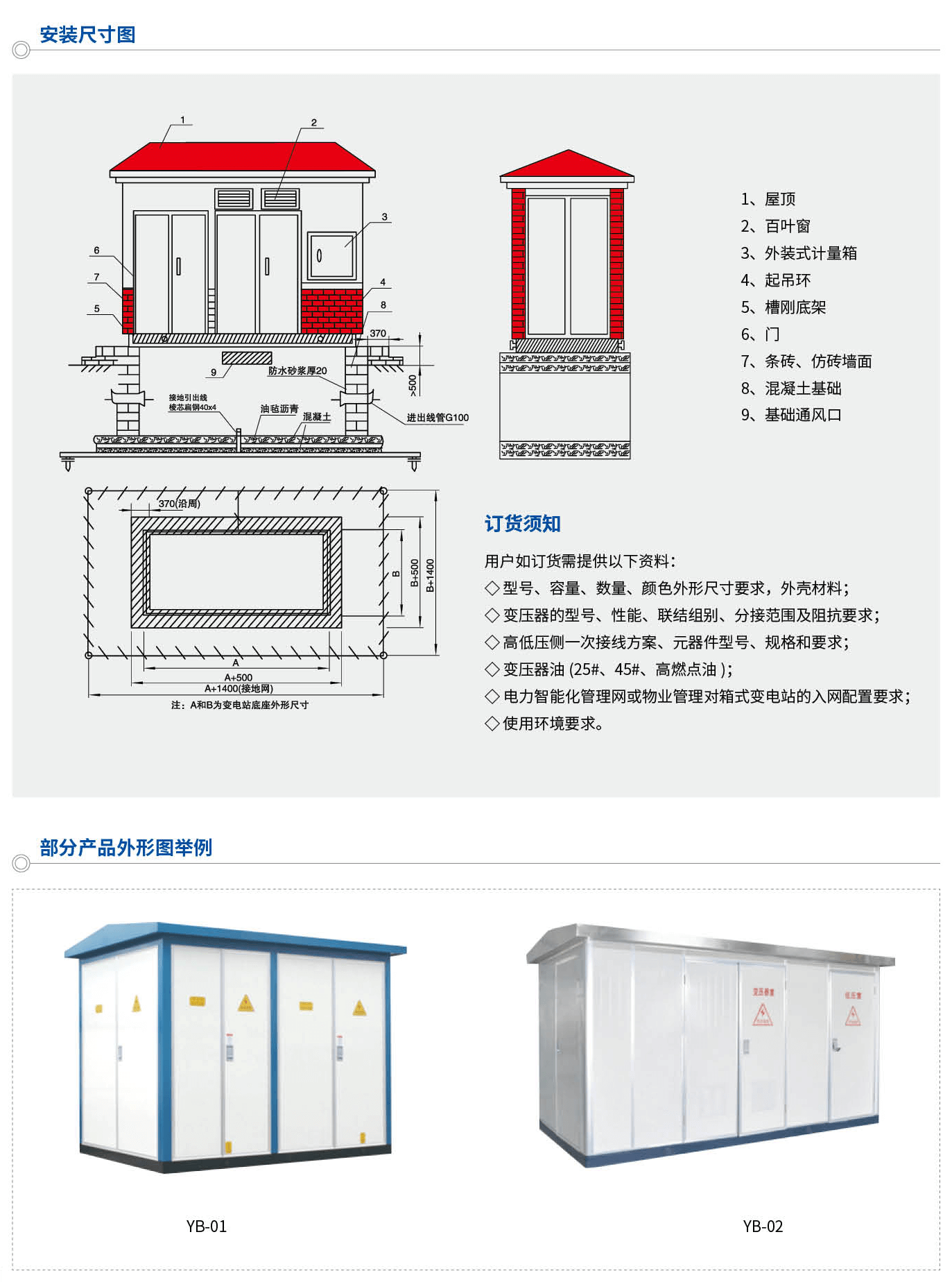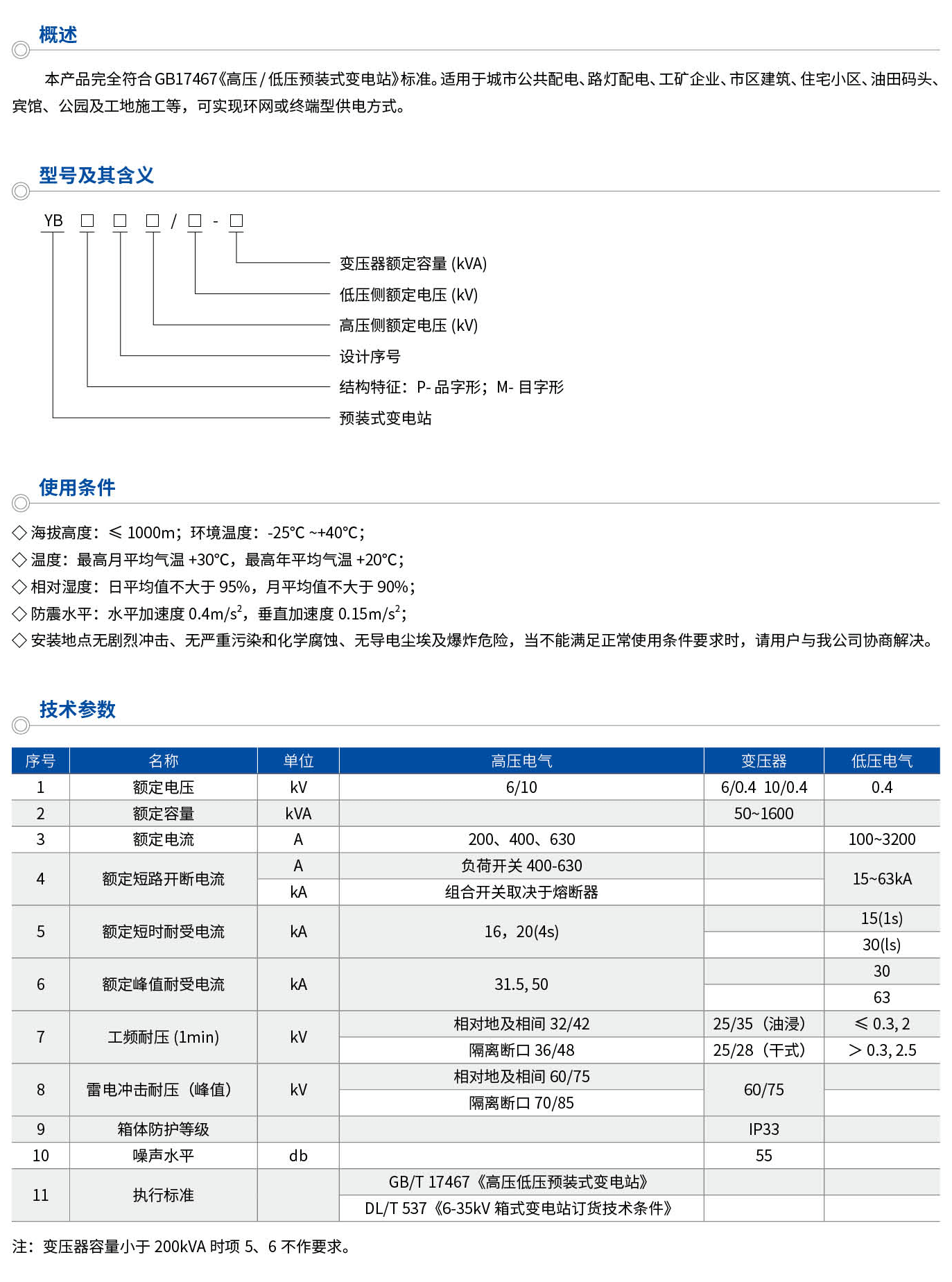本產(chǎn)品完全符合GB17467《高壓/低壓預(yù)裝式變電站》標(biāo)準(zhǔn)。適用于城市公共配電、路燈配電、工礦企業(yè)、市區(qū)建筑、住宅小區(qū)、油田碼頭、賓館、公園及工地施工等,可實(shí)現(xiàn)環(huán)網(wǎng)或終端型供電方式。