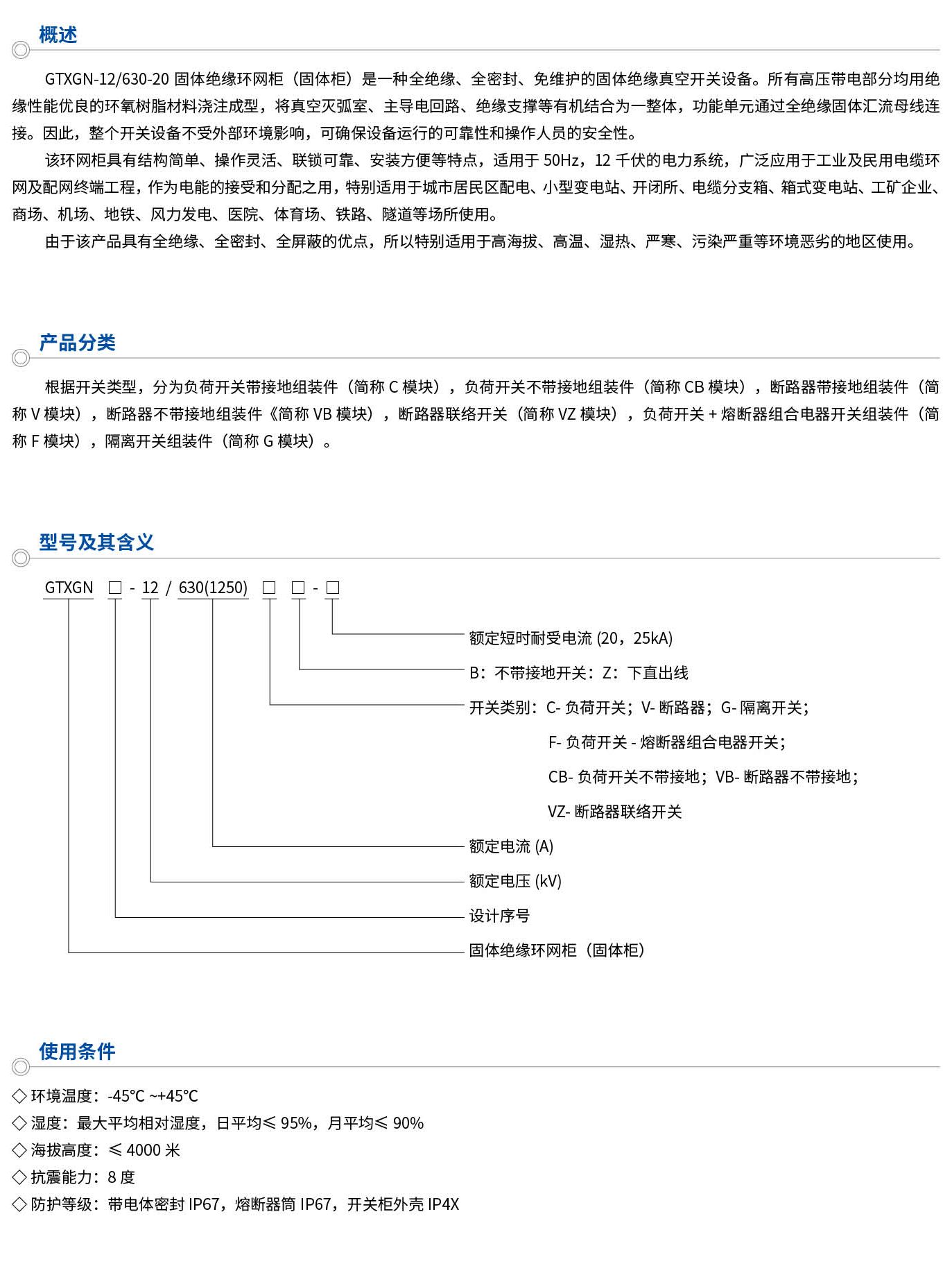 GTXGN-12/630-20固體絕緣環(huán)網(wǎng)柜(固體柜)是一種全絕緣、全密封、免維護的固體絕緣真空開關設備。所有高壓帶電部分均用絕緣性能優(yōu)良的環(huán)氧樹脂材料澆注成型,將真空滅弧室、主導電回路、絕緣支撐等有機結合為一整體,功能單元通過全絕緣固體匯流母線連接。因此,整個開關設備不受外部環(huán)境影響,可確保設備運行的可靠性和操作人員的安全性。該環(huán)網(wǎng)柜具有結構簡單、操作靈話、聯(lián)鎖可靠、安裝方便等特點,適用于50Hz,12千伏的電力系統(tǒng),廣泛應用于工業(yè)及民用電纜環(huán)網(wǎng)及配網(wǎng)終端工程,作為電能的接受和分配之用,特別適用于城市居民區(qū)配電、小型變電站、開閉所、電纜分支箱、箱式變電站、工礦企業(yè)、商場、機場、地鐵、風力發(fā)電、醫(yī)院、體育場、鐵路、隧道等場所使用。由于該產(chǎn)品具有全絕緣、全密封、全屏蔽的優(yōu)點,所以特別適用···