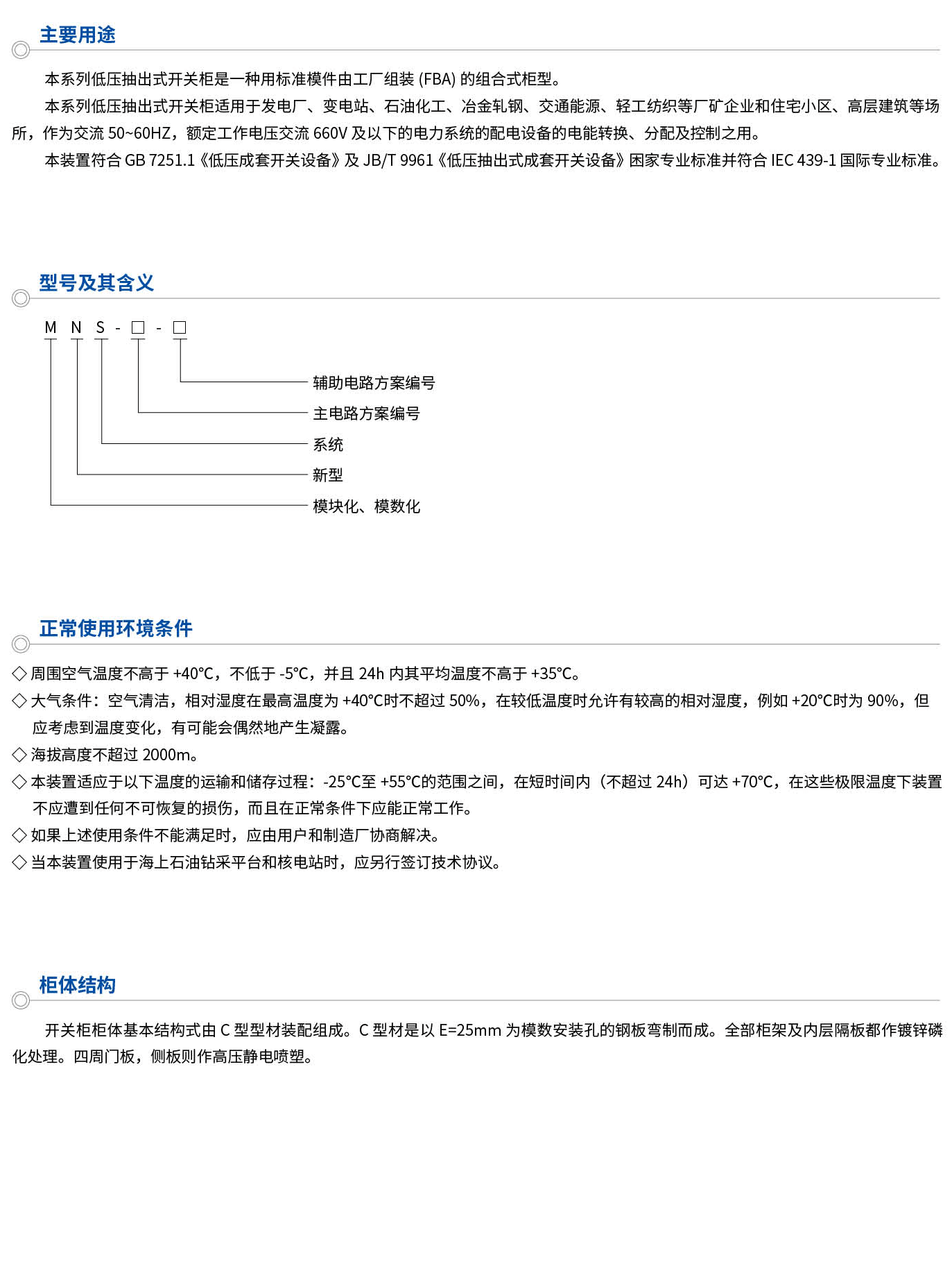 本系列低壓抽出式開關柜是一種用標準模件由工廠組裝(FBA)的組合式柜型。本系列低壓抽出式開關柜適用于發電廠、變電站、石油化工、冶金軋鋼、交通能源、輕工紡織等廠礦企業和住宅小區、高層建筑等場所,作為交流50~60HZ,額定工作電壓交流660V及以下的電力系統的配電設備的電能轉換、分配及控制之用。本裝置符合GB7251.1《低壓成套開關設備》及JB/T9961《低壓抽出式成套開關設備》困家專業標準并符合EC439-1國際專業標準。